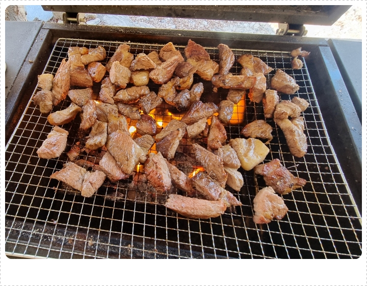 2시간쯤 지났을까 어느정도 숯이 만들어졌을때 사온 고기를 굽기 시작했다. 이번엔 돼지 목살이 메인이며 목살은 10팩, 입가심으로 소고기 등심 2팩을 샀다. 우리는 목살에 초장을 찍어 먹는데 쌈장보다 맛이 있다.