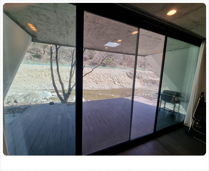 건물 안으로 들어가면 길고 넓은 주방과 초대형TV, 계곡뷰를 볼 수 있다. 화장실은 샤워실과 분리되어 있고 2층에 화장실에 하나 더 있었다. 세탁실에서는 필요에 따라 세탁도 할 수 있는 것 같았다. 주방은 싱크대가 2개여서 바베큐 준비하는게 편리하고 좋다. 냉장고는 가져온 주류를 다 넣고도 남을 만큼 크다. 여기를 선택한 가장 큰 이유는 눈, 비가 와도 바베큐를 할 수 있기 때문이다. 그래서 더더욱 여름에 한 번 더 와보고 싶은 곳이다.