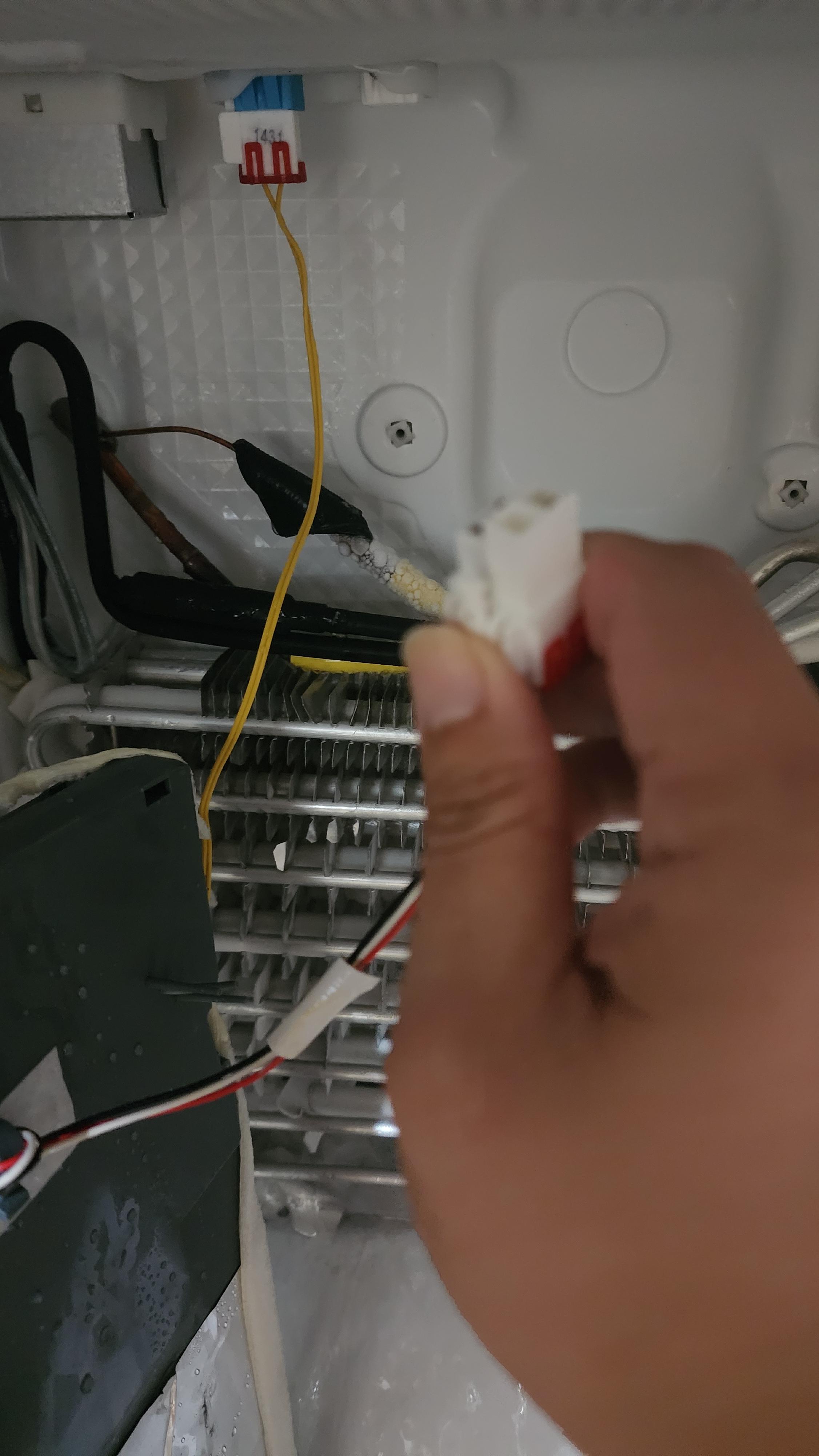 덮개를 치우니 걸리적 거리는 선들이 보인다. 뺄껀빼고 까먹을까봐 사진을 찍었다. 배수구쪽을 보니까 얼음이 냉각판사이로 꽁꽁 얼어있다. 드라이버나 망치로 했다간 냉각판이 고장날 수 있으니 여기서부턴 드라이기로 열을 가해보기 시작했다. 냉각을 시켜주는 장치이기때문에 가까이 열을 가하면 안될 것 같아 거리를 두고 얼음이 녹기만을 기다린다.