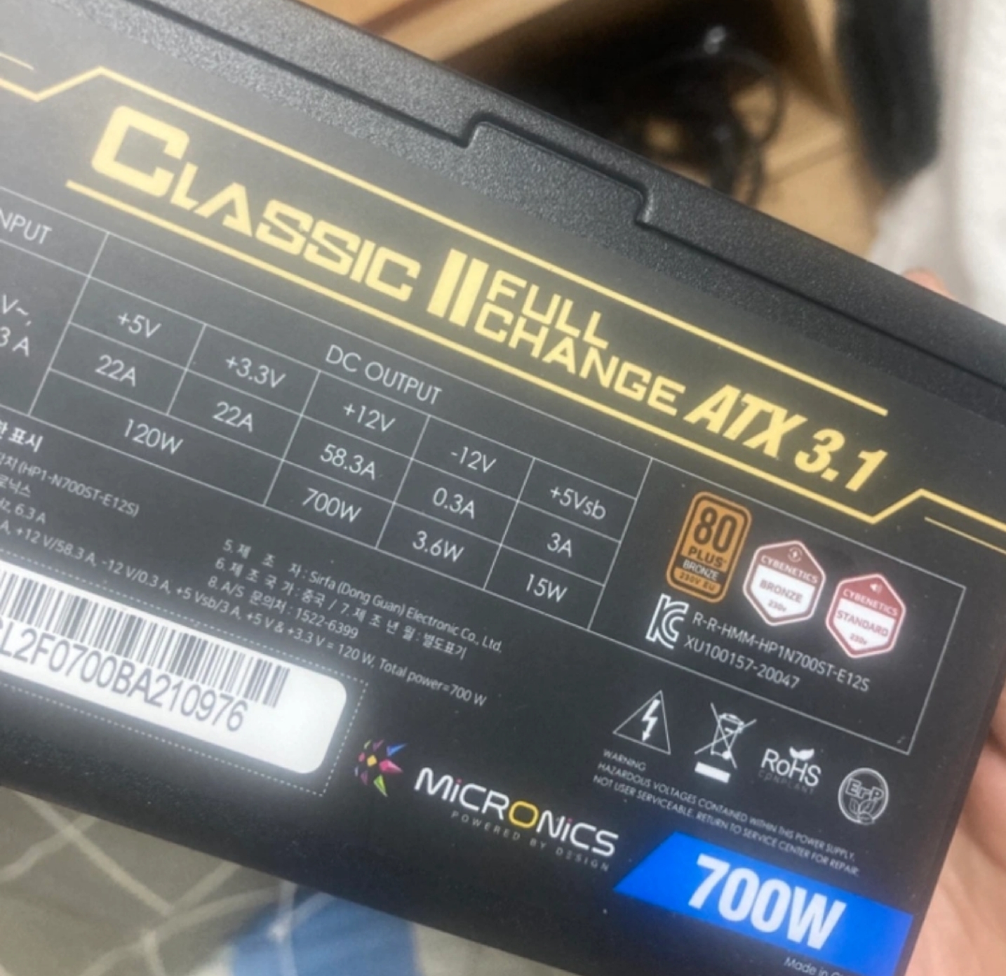 그다음은 파워다. 현재 500W를 쓰고 있고 마이크로닉스 제품이다. 잘만 파워는 이전 컴퓨터 사용할때 안좋은 추억이 많아서 쳐다보지도 않는다. 그래픽카드가 550W를 권장하기 때문에 600W로 바꿀까하다가 당근을 보는데 3주 사용한 700W를 판다는 것이다. 그것도 마이크로닉스!! 잔고장 하나도 없이 잘 썼기때문에 왠지 제품에 믿음이가서 바로 산다고 했다.